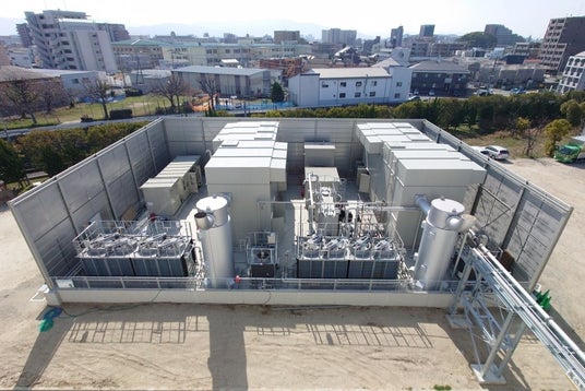 ヤンマーエネルギーシステムは、2023年3月に本システム2台(990kW×2台)を福岡県御笠川浄化センターに初納入し、民設民営の消化ガス発電事業で活用されています。ここでは、下水処理で発生した消化ガスから、年間で一般家庭2000世帯相当の電気を発電します。