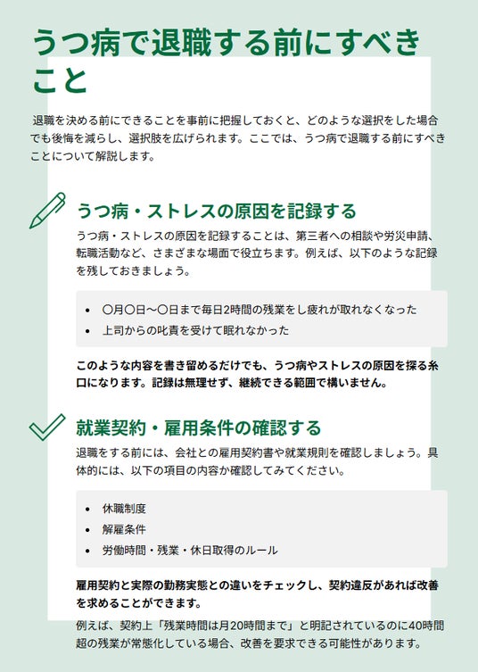 本資料では、うつ病で退職する前の段階から、実際に退職する際の流れ、退職後にすべきことなどをわかりやすく解説します。