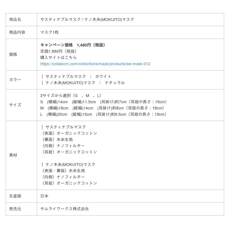 サムライワークス株式会社(代表取締役社長:新島 実 本社所在地:東京都渋谷区)は、緊急事態宣言発表を目前に控え少しでも感染拡大に歯止めをかけるため、天然素材「木糸」の自然の力で、抗菌作用、通気性・保温性・調湿性・UVカット、また飛沫・感染防止のため、医療用マスクとして使用されるN95マスクとほぼ同等の0.1㎛の微粒子を99%カットする”YAMASHIN NANO FILTER(TM)”を使用した「サスティナブルマスク・ナノ木糸(MOKUITO)マスク」を、キャンペーン価格1,480円(税抜)で追加販売を開始致します。「サスティナブルマスク・ナノ木糸(MOKUITO)マスク」は、医療用レベルの高性能フィルターと天然素材の機能性を掛け合わせた「人にやさしく、地球にやさしい」サスティナビリティーなマスクです。
