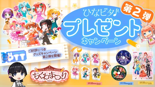 株式会社コナミアミューズメントは「ひなビタ♪」10周年を記念した「BEMANI(ビーマニ)」機種でのゲーム内イベント「BEMANIちくわまつり2023」において、「ひなビタ♪プレゼントキャンペーン第2弾」を2024年2月28日(水)から2024年3月24日(日)まで開催することをお知らせします。2023年12月21日(木)から2024年2月4日(日)に開催された「ひなビタ♪プレゼントキャンペーン」(第1弾)がご好評いただいたことから、このたび追加開催となりました。「ひなビタ♪プレゼントキャンペーン第2弾」では「BEMANI」機種をプレーしたり「e-amusement購買部」で対象アイテムを購入したりすることで獲得できる「PTT(ぺったんチケット)」をためると、先着で「ちくわまつり2023スペシャルアクリルブロック」や「ちくわまつり2023スペシャルCD」がもらえます。さらに抽選で「ちくわまつり2023スペシャルクリアファイル」が当たります。ぜひ、この機会に「BEMANIちくわまつり2023」をお楽しみ下さい。▼「BEMANIちくわまつり2023」イベントサイト