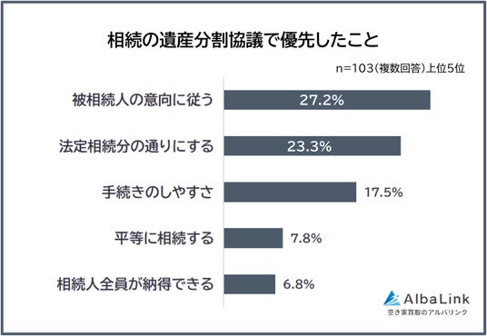 相続の遺産分割協議で優先したことを聞いたところ、1位は「被相続人の意向に従う(27.2%)」でした。2位は「法定相続分の通りにする(23.3%)」となっています。