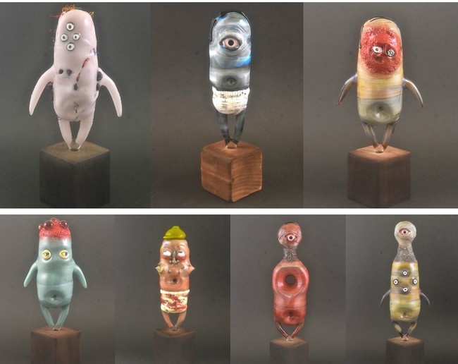 また、今回の作品では不透明な色ガラスを中が空洞のガラス管の状態に形づくり、内側には糸や液体を入れることでモンスターの内面や溢れ出るエネルギーを表現しています。