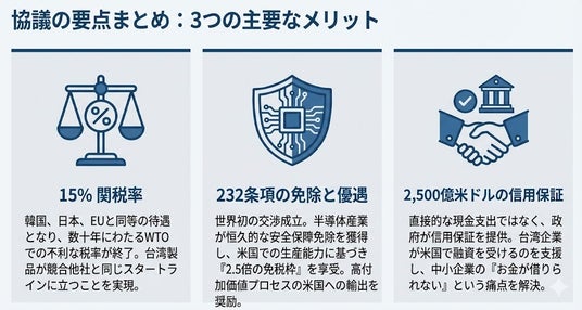世界で初めて米国通商拡大法232条(安全保障条項)の免除を獲得。特筆すべきは、米国生産能力の「2.5倍」を台湾からの無関税輸出枠とする条項です。TSMCはこの枠を最先端プロセスに戦略配分することで、実質的な対米輸出の完全免税化が可能となり、競合他社に対する圧倒的な優位性を確立します。