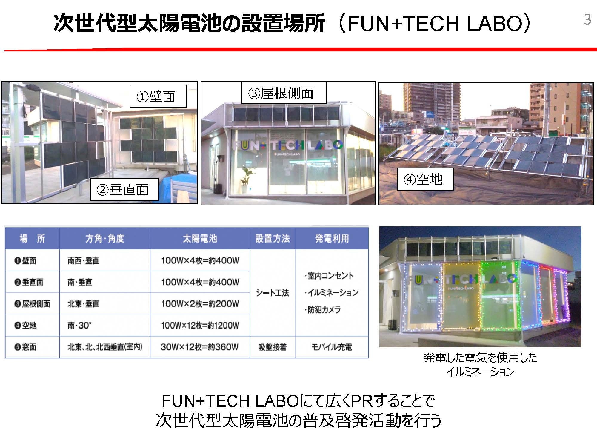 本実証実験では、相模原市リニア駅周辺のイノベーション創出促進拠点である「FUN+TECH LABO」(ファンタステックラボ、JR東海が運営)において、建物の壁面、窓および空き地に、「薄い、軽い、割れない」特徴を持つカルコパイライト太陽電池を設置しました。これまで設置が困難だった壁面等への施工性の確認や、暴風等に対する安全性の確認、方角や角度に応じた発電量の違いについて検証を行う事を目的としています。発電した電力は建物室内の電化製品、屋外の防犯カメラやイルミネーション等で利用します。なお、「FUN+TECH LABO」で実証実験を行うのは今回が初の事例となります。