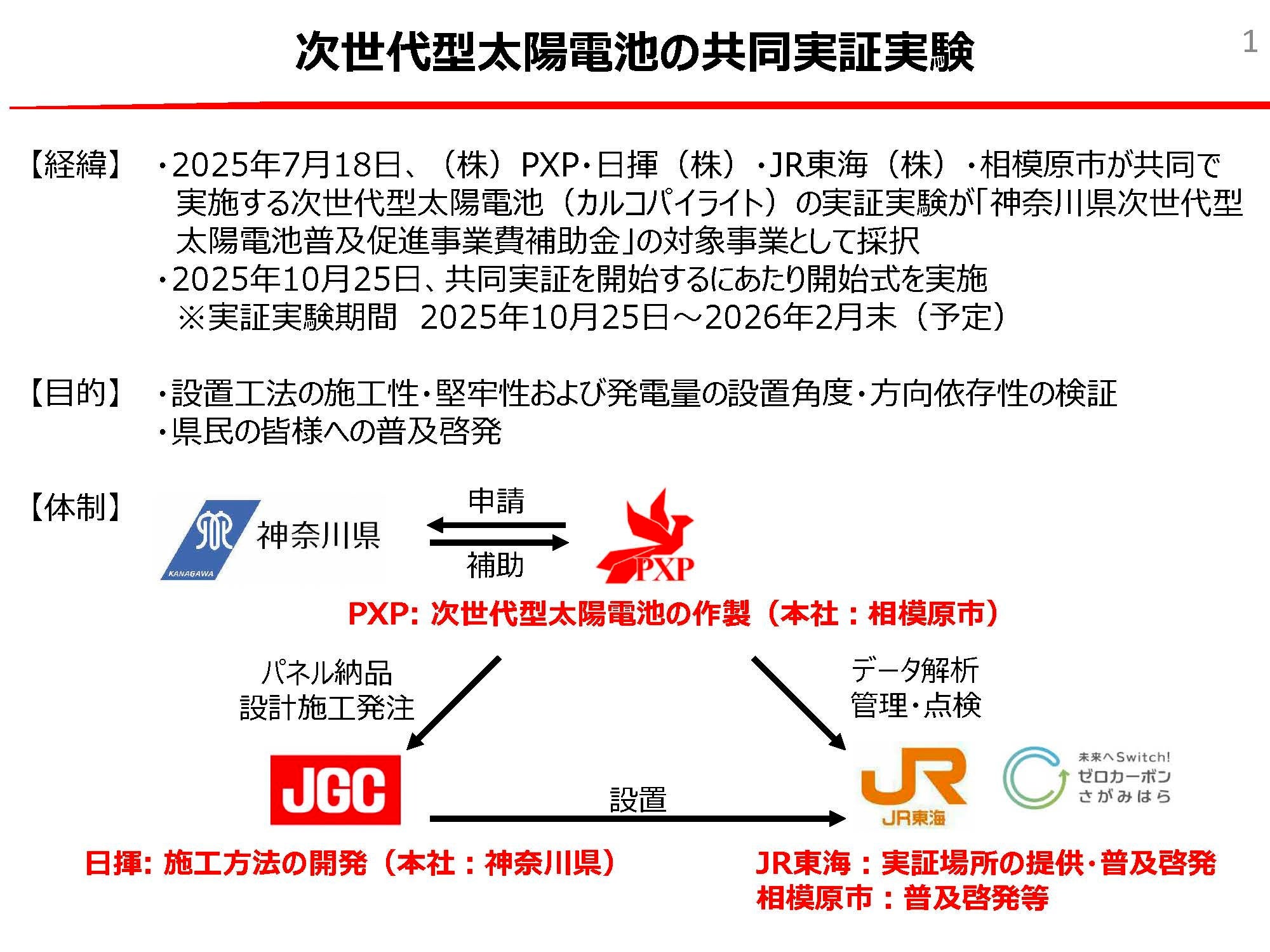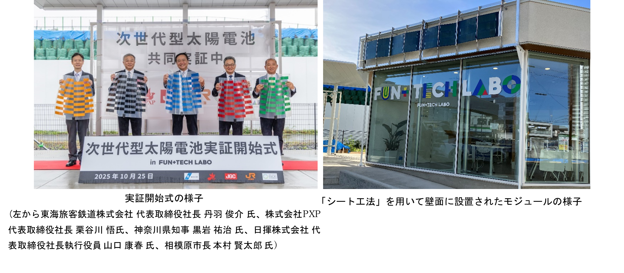 東海旅客鉄道株式会社(以下、「JR東海」)、株式会社PXP(以下、「PXP」)、日揮株式会社(以下、「日揮」)は、神奈川県相模原市(以下、「相模原市」)と共同で、2025年10月25日に次世代型太陽電池であるカルコパイライト太陽電池実証開始式を開催しましたので、お知らせします。