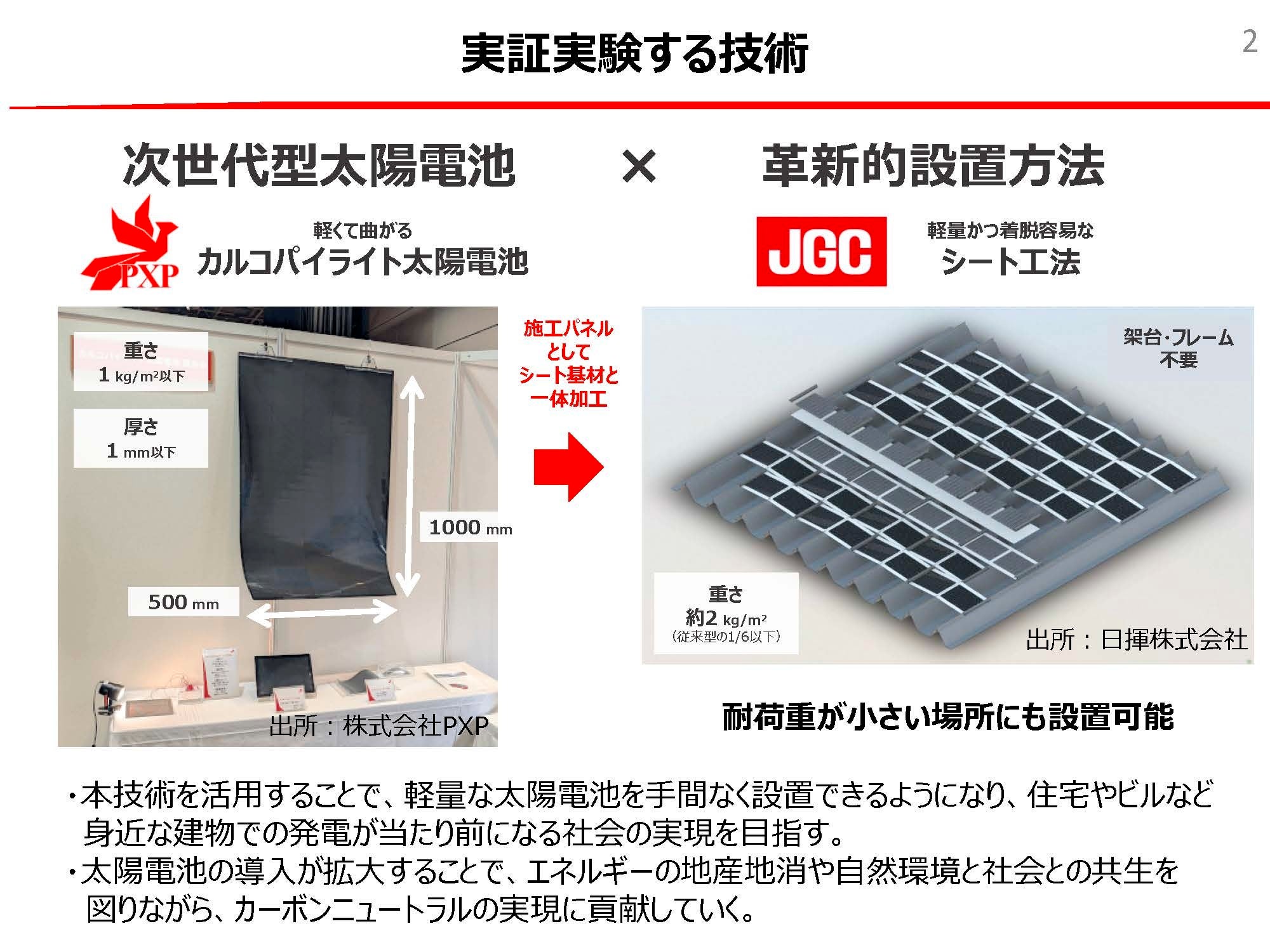 本取り組みにおいて、PXPはソーラーパネルの設計‧製造、データ解析‧点検等、日揮は「シート工法」を用いた安全性・施工性・軽量性を両立したモジュール(あらかじめ架台にカルコパイライト太陽電池を組み込んだもの)の設置、JR東海は実証場所の提供と普及啓発活動、相模原市は普及啓発活動等を行います。