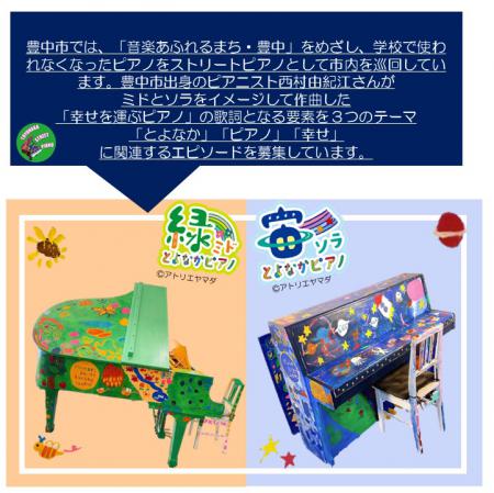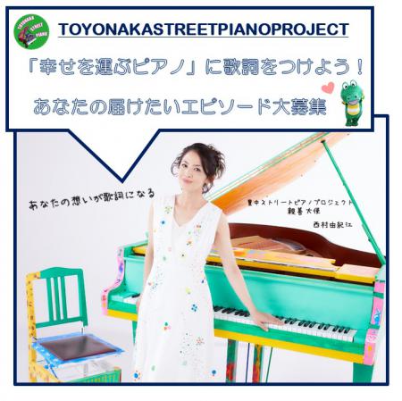 豊中市は、豊中ストリートピアノプロジェクトの親善大使である西村由紀江さんが作曲した「幸せを運ぶピアノ」の歌詞の要素となる3つのテーマ「とよなか」「ピアノ」「幸せ」に関連するエピソードを募集しています。