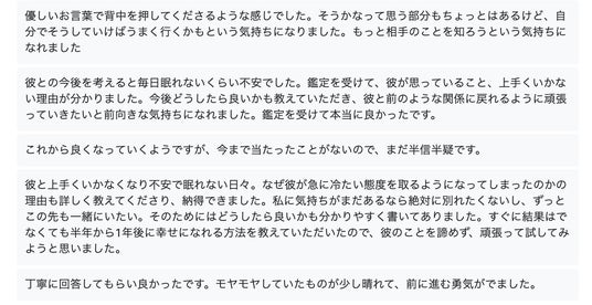 『はじめまして。占い師の聖子ともうします。こうしてこちらをご覧頂いているということは何か恋愛への悩みがあるからだと思います。「80億」これが何の数字だかわかりますか?これは世界の現在の人口数です。片思いのあの人、復縁したいあの人、秘密の恋をしているあの人…、あなたと彼は80億分の1の確率で出会ったまさに「奇跡」です。そんな奇跡を悲しい奇跡としてではなく、幸せな奇跡だと信じれるような、不安や悲しみを取り除き前向きな気持ちに向かって頂ける鑑定を心がけております。何か恋愛のお悩みがあるのでしたら是非、私にご相談下さいませ。』