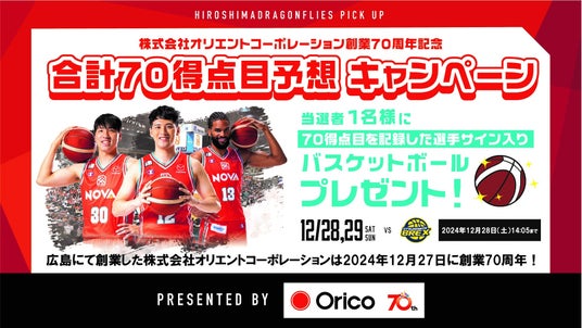ゴールドパートナーとしてまずは、、12月28日および29日に行われる広島ドラゴンフライズのホームゲームで「オリコ創業70周年企画」を実施いたします。オリコの創業70周年にちなんで、広島ドラゴンフライズが70得点目を記録した選手を予想するキャンペーンや、オリコの営業拠点のある広島市中区の立小学校へのバスケットボールの進呈を予定しております。