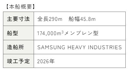 本船はSAMSUNG HEAVY INDUSTRIES CO., LTD.(本社:韓国)のコジェ造船所にて建造され、2026年に竣工、当社が船舶管理を行い、JERA向けのLNG輸送に従事する予定です。