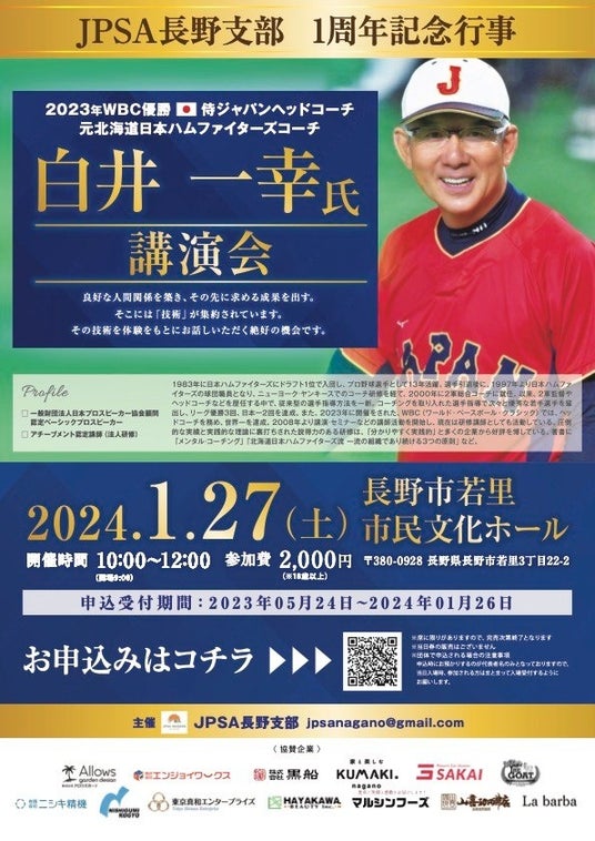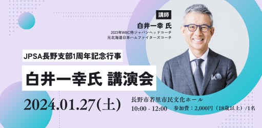 一般財団法人 日本プロスピーカー協会(以下、「JPSA」)長野支部の設立1周年記念行事として、1月27日に長野市若里市民文化ホールにて、記念講演会を開催いたします。講師として登壇するのは、2023年WBC侍ジャパンでヘッドコーチを務めた白井一幸氏。劇的な勝利を創り出したチームづくりの舞台裏から、良好な人間関係を築きながら組織を育てる秘訣をお伝えいたします。