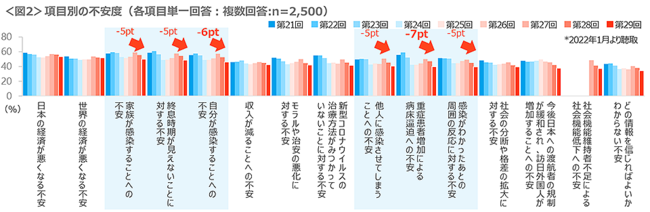 先月と比べ項目別不安度は、「病床逼迫」「自分が感染する」など全項目で割合は低下した。一方で、「日本の経済が悪くなる」「世界の経済が悪くなる」は不安度のTOP2であった。この2項目は新型コロナウイルスの影響に加え、2月末からの世界情勢の行方への懸念が起因したものと推察される。<図2>