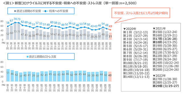 株式会社クロス・マーケティング(本社:東京都新宿区、代表取締役社長:五十嵐 幹)は、新型コロナウイルスが消費者の行動や意識に与える影響の把握を目的として、全国47都道府県に在住する20~69歳の男女2,500人を対象に「新型コロナウイルス生活影響度調査」を第1回(2020年3月12日~13日)から定期的に実施。2022年3月の第29回は、まん延防止等重点措置が全面解除された直後の3月25日~27日に調査を行い、人々の意識・行動について分析しました。