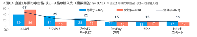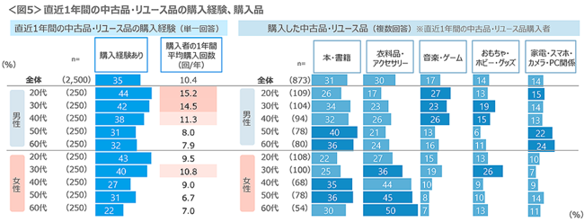 直近1年間、中古品・リユース品の購入経験は35%であり、経験者の1年間平均購入回数は10.4回。特に男性20代、30代は年平均14~15回と多い。購入した品物は、男性で「本・書籍」「音楽・ゲーム」、女性は「衣料品・アクセサリー」が多い。購入先は「メルカリ」「ヤフオク!」「ブックオフ・ハードオフ」が高く、「メルカリ」は女性で、「ヤフオク!」は男性の利用が目立つ。 <図5、6>