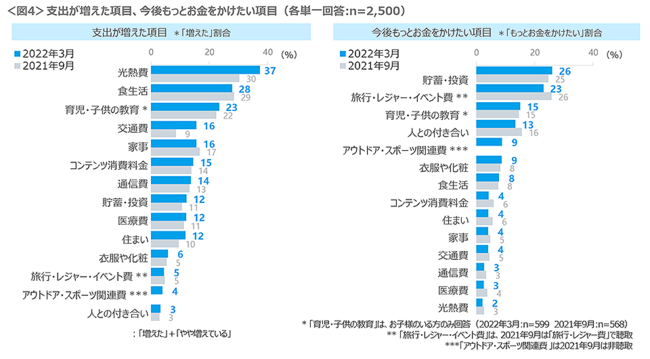 項目別の支出は、2021年9月結果と同様に「光熱費」「食生活」「育児・子供の教育」の3項目の増加が多い。特に「光熱費」は値上げも重なり2021年9月より7p増加。”お金をかけたい”項目は、「貯蓄・投資」と「旅行・レジャー・イベント費」。「貯蓄・投資」は、9月結果より上昇、「旅行・レジャー・イベント費」は横ばい。<図4>