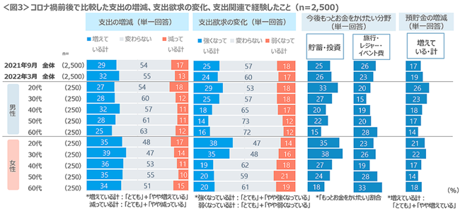 コロナ禍以降、支出が「とても+やや増えている」は32%であり、現在”お金を使いたい””何かを買いたい”気持ちは、「とても+やや強くなっている」が24%と、支出への意欲はみてとれる。支出欲求は、男女ともに20代、30代で高い。この世代の”お金をかけたい”項目は、「貯蓄・投資」がTOP、「貯蓄額」の増加も2割を超える高さであり、若い世代は将来を見据えて「貯蓄・投資」を増やしたい意向が強いといえる。<図3>