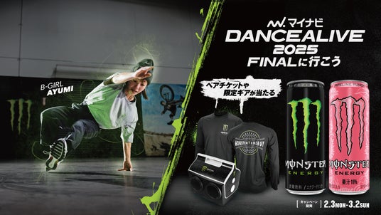 モンスターエナジーは、2025年4月20日(日)両国国技館にて開催される「マイナビDANCEALIVE 2025 FINAL」をオフィシャルドリンクスポンサーとしてサポートいたします。開催を記念し、本大会のペアチケットや、「モンスタースピーカー付きクーラーボックス」「モンスター 長袖Tシャツ」などの限定ギアがあたるキャンペーンを実施いたします。