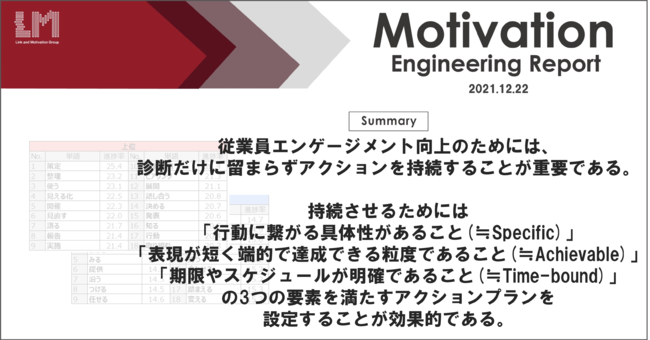 株式会社リンクアンドモチベーション(本社:東京都中央区、代表:小笹芳央、証券コード:2170、以下当社)の研究機関モチベーションエンジニアリング研究所(以下当研究所)は、「従業員エンゲージメント向上のための効果的なアクションプラン」に関する調査を行いましたので、結果を報告いたします。