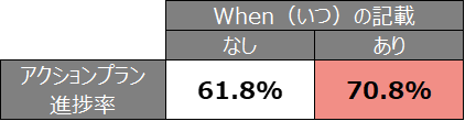 このことから、期限やスケジュールが明確であると、アクションプランの進捗率が高いと言える。