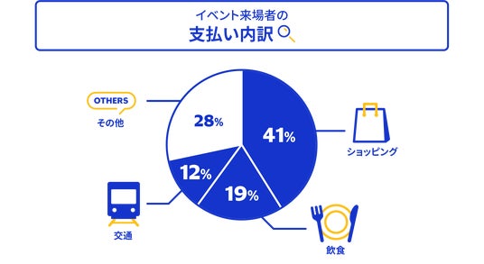 しかも、その増加はイベント・チケットによる増加分だけではなく、それ以外の業種での波及効果も見られました。イベントの期間*2、イベント来場者が特にデパート、アパレル/アクセサリー、電子機器を含むショッピングと、飲食で多く支払いをしていることがわかりました。例えば、支払いの内訳をみると、ショッピングが41%を占め、続いて飲食が19%、そして、交通に12%という結果でした。