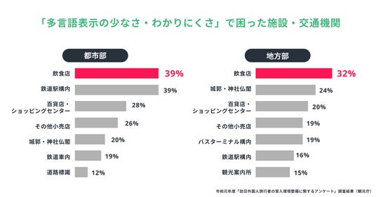 また、観光庁が発表した「訪日外国人旅行者の受入環境整備に関する現状調査」(※1)によると、インバウンド観光客が「多言語表示の少なさ・わかりにくさ」について困る割合の高い施設として「飲食店」が都市部・地方部どちらにおいても上位にあがる結果となっています。