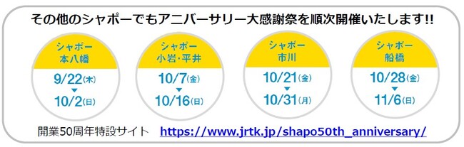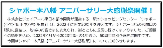 2022年9月22日(木)~10月2日(日)の期間中、シャポー本八幡では開業50周年を記念した「アニバーサリー大感謝祭」を開催いたします。 期間中は、シャポー本八幡限定の特別企画イベントを開催するほか、各ショップにて、50周年記念限定商品の販売やお得なセールなどを実施いたします。