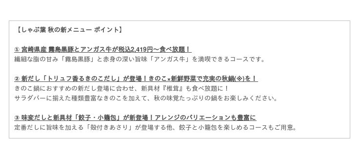 株式会社すかいらーくレストランツ(本社・東京都武蔵野市、代表取締役社長 中島 尚志)が運営する「しゃぶ葉」では、2022年9月15日(木)より、「霧島黒豚&アンガス牛 食べ放題コース」を販売。同日より、「世界のだしめぐり フランス編」と題し、トリュフ香る「きのこだし」の提供を開始いたします。