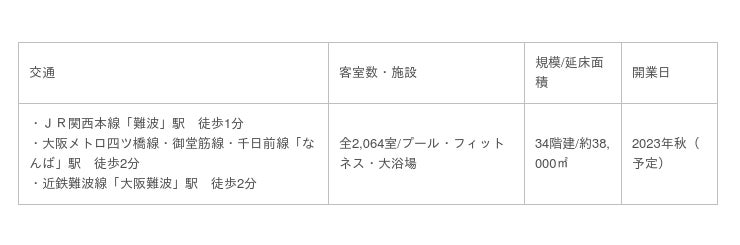 本案件地では、アーバンリゾート大型タワーホテルを計画しており、ホテル名は(仮称)アパホテル&リゾート〈大阪難波駅タワー〉とし、客室数が2,064室の西日本最大※客室数のホテルとして、2023年秋開業を目指す。スイートルーム・デラックスツインルーム・トリプルルーム・4名利用が可能なコネクトルーム・バリアフリールーム等、バリエーション豊かな客室タイプや、共用部にはプール・フィットネス・大浴場等の充実した施設の完備を計画している。
