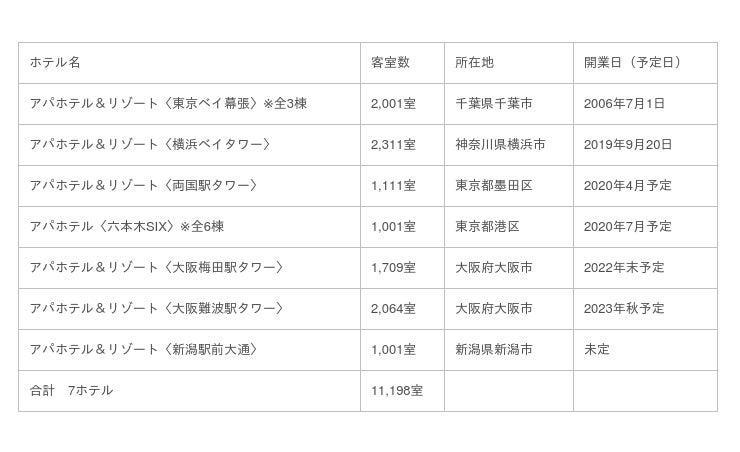 なお、アパグループは全国で大型ホテルの出店に注力しており、ホテル単体として日本最高層となるアパホテル&リゾート〈東京ベイ幕張〉(50階建・全2,001室・千葉県千葉市美浜区)、本年9月20日に開業したホテル単体として日本最大級となるアパホテル&リゾート〈横浜ベイタワー〉(35階建・全2,311室・神奈川県横浜市中区)を運営中であるほか、現在計画中のアパホテル&リゾート〈両国駅タワー〉(31階建・全1,111室・東京都墨田区・2020年4月開業予定)、アパホテル〈六本木SIX〉(全6棟・1,001室・2020年7月開業予定)、アパホテル&リゾート〈新潟駅前大通〉(全1,001室・新潟市中央区・開業日未定)を含む、1,000室超のメガホテルを7ホテル運営・計画中となる。