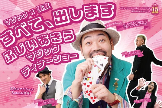 バラエティー番組や様々なメディアで活躍するマジシャンふじいあきらをはじめ、関西を中心に人気のマジシャンRobin、東海エリアで人気のDJ T-Kayがラ・スイート神戸オーシャンズガーデンに集結!ステージでのマジックショーだけでなく、客席でのテーブルマジックも披露し、DJパフォーマンスと、今井調味料による司会でさらにショーを盛り上げます。