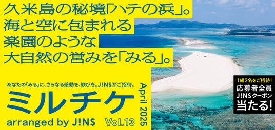 株式会社ジンズ(以下JINS)は、日常では体験できない特別な「みる(見る・観る・視る)」をチケットにして毎月抽選でご招待する「ミルチケ」(https://www.jins.com/jp/campaign/miruticket/)のVol.13として、久米島の秘境「ハテの浜」で海と空に包まれる楽園のような大自然の営みを「みる」体験への応募受付を、2025年4月1日(火)より開始します。