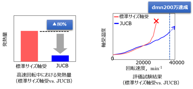 高速回転で軸受を使用する場合、大きな遠心力や玉の進み遅れによる影響で、保持器の破損や軸受内部の急激な温度上昇が懸念されます。ジェイテクトでは、MBD技術によって高速回転中における軸受内部の負荷状態と温度分布を予測し、耐久性を担保しながら昇温を抑制することができるバランス設計を実現しました。従来の標準サイズ軸受の冠形保持器に対して、合わせタイプにすることによって非常に小さな断面積ながら遠心力による保持器の変形を抑制することが可能となり、保持器と他部品との接触による発熱量を従来比で80%削減できることを確認しました。通常、高速回転用軸受の保持器には、剛性や耐熱性、耐久性に優れる高価な樹脂材料を採用する必要がありますが、開発品では保持器材料の変更を行うことなく、省スペース化と高速化を同時に実現できることを目途づけしました。実際に軸受を高速回転させる評価試験において、JUCBは標準サイズ軸受よりも高速回転時の温度上昇を抑制することができ、世界最速レベルのdmn200万の高速性能を達成することができました。本結果により、JUCBはeAxleをはじめとした幅広い駆動ユニットの小型化・軽量化に貢献できることが期待されます。