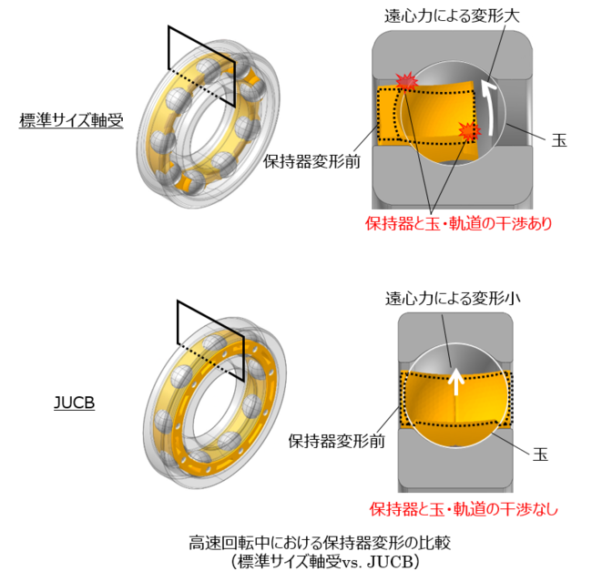 従来の標準サイズの軸受では、片持ち形状の冠形保持器を採用していましたが、コンパクト化の観点では構造上の限界がありました。JUCBでは、2016年9月にプレスリリースした合わせタイプ保持器のノウハウを活用することで、そのような課題を解決しました。