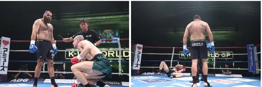 初代・第3代K-1 WORLD GP クルーザー級王者で“全身ヒール”のシナ・カリミアン(イラン)は、“グリズリー”クラウディオ・イストラテ(イタリア)と対戦。カリミアンは、前回試合で判定負けとなりリベンジを果たすか注目が集まる試合となりましたが、イストラテのパンチがカリミアンの後頭部に入り、試合中断。審判長が「試合続行できない」と判断しドクターストップで後日運営協議の上、裁定を発表に。