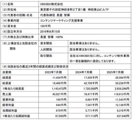 当社とXINOBIX社は、従来よりコンテンツ制作業務において継続的な取引関係にあり、XINOBIX社の持つ専門性および制作体制について高い評価を行ってまいりました。今般、XINOBIX社をグループに迎えることで、外注コストの内製化による収益性の向上に加え、当社のデジタルマーケティングの知見とXINOBIX社の制作力をより強固に融合させ、サービス付加価値のさらなる向上を期待できることから、株式を取得し、子会社化することにいたしました。
