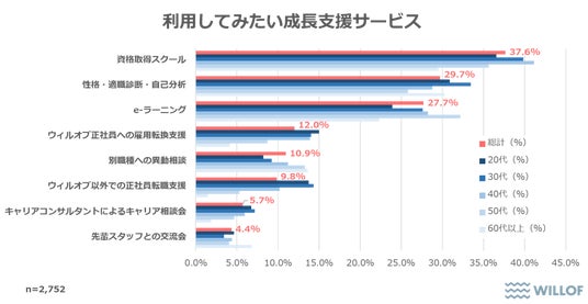 最後に【利用してみたい成長支援サービス】について聞いたところ 「資格取得スクール(37.6%)」が最も多くなり、年代別で見ると特に40代の回答率が高くなりました。次に多かった回答は「性格・適職診断・自己分析(29.7%)」で特に30代の選択率が高くなりました。また「ウィルオブ正社員への雇用転換支援(12.0%)」「ウィルオブ以外での正社員転職支援(9.8%)」を選んだ、全体の18.2%の派遣社員が正社員転換を希望していることが分かりました。
