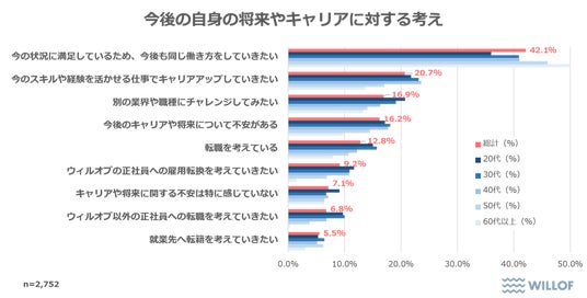 次に【今後の自身の将来やキャリアに対する考え】について聞いたところ、「今の状況に満足しているため、今後も同じ働き方をしていきたい(42.1%)」が最も多くなり、前回調査より+4.9%となりました。年代別で見ると、年代が高くなるにつれて現状満足度が高まる傾向が見受けられました。次に多かった回答の「今のスキルや経験を活かせる仕事でキャリアアップしていきたい(20.7%)」は前回調査よりも-4.1%となりましたが、年代別では40代のキャリアアップ志向が高い傾向が見受けられました。