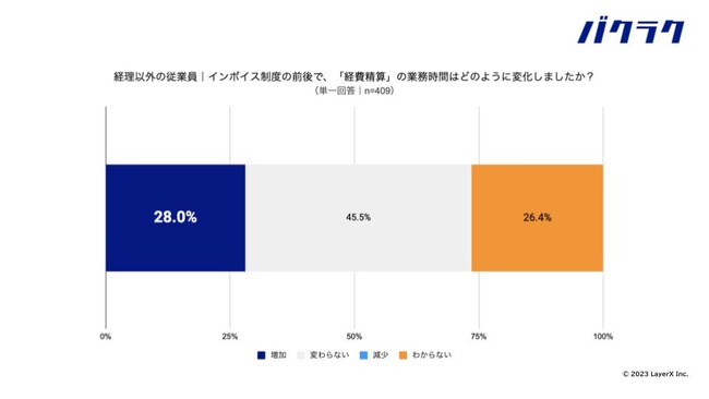 経理以外の従業員409名を対象に、インボイス制度の前後で、「経費精算」の業務時間がどの程度変化したかを聞いたところ、28.0%が増加したと回答しました。
