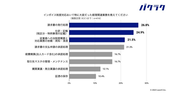 経理担当者414名を対象に、インボイス制度対応において特に大変だった経理関連業務を聞いたところ、1位「請求書の発行処理」(26.8%)、2位「仕訳・記帳(税区分・特例事項の記載)」(24.9%)、3位「従業員への法制度概要と対応業務の依頼・周知・浸透」(21.5%)となりました。