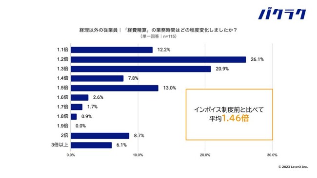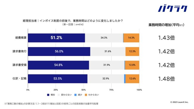 次に、業務時間が増加したと回答した方を対象に、業務時間がどの程度変化したかを聞いた上で平均値を算出したところ、インボイス制度開始前と比べて、「経費精算」業務時間は約1.43倍、「請求書発行」は約1.42倍、「請求書受領」は約1.42倍、「仕訳・記帳」は約1.48倍となりました。