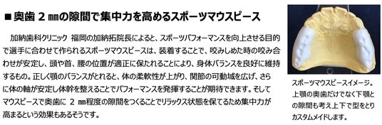 なお、スポーツパフォーマンス向上を目的としたマウスピースではコンタクトスポーツでの保護用のものと異なり、奥歯だけに装着することで違和感を軽減。頭蓋骨と一体で安定感がある上顎のみに装着するのですが、歯型を上下両方とることでより高い装着感と個人に合わせたカスタマイズができます。