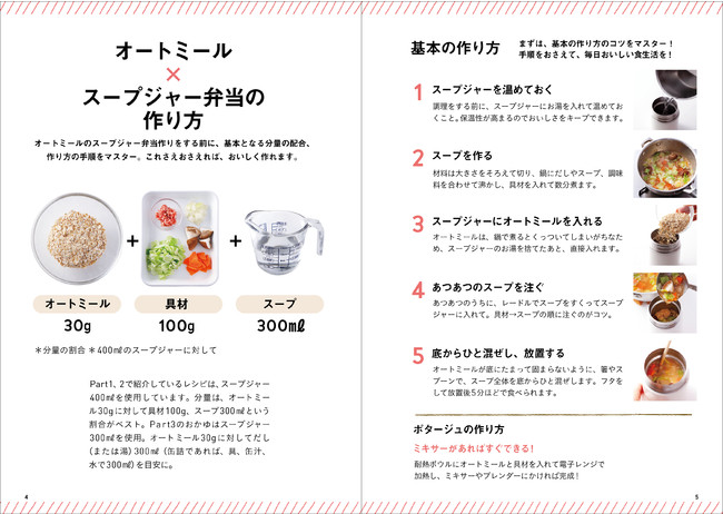 本書は、食物繊維が豊富なことで人気のダイエット食材「オートミール」をランチにムリなく食べるために、スープジャーを活用して作るお弁当レシピを紹介しております。作り方はシンプルで、オートミールを入れたスープジャーに温めたスープを注いで放置するだけ! 手軽に作れるだけでなく、オートミール以外の素材も一緒に食べることができるため、いろいろな栄養素をまるごと摂ることができます。