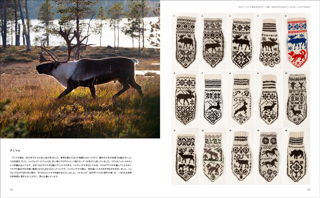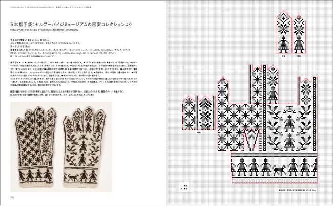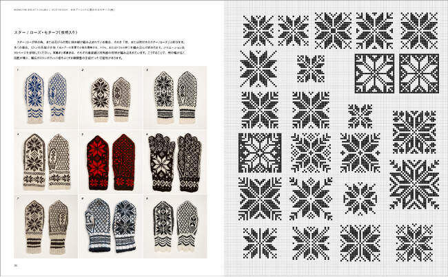 スターやローズといったセルブーミトンの代表的なモチーフに加え、手の平側に使う幾何学模様、カフや親指のマチ、ミトンの両サイドに使う連続柄も多数収録。実物のミトンの写真と図案で詳しく解説しています。伝統ミトンのさまざまなテクニックをはじめ、大量のモチーフを惜しげもなく紹介しているのは圧巻です!