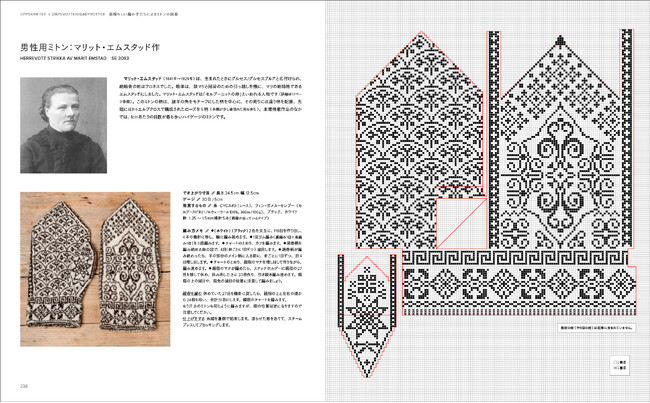 日本語版では、原書版(『SELBUVOTTER』2016年・ノルウェー 刊)のシンプルな編み図に、編み目記号の説明や柄が挿入される箇所の補足を加えました。巻末にはオリジナルミトンが作れる子供用チャート、女性用チャート、男性用チャートがついています。