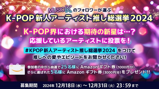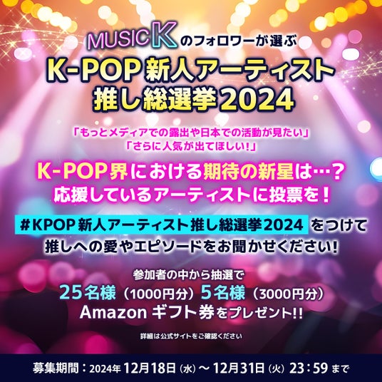 株式会社IMXC(IMXC、本社:東京都世田谷区、代表取締役社長:中村赫也)は、今年一年皆さまを虜にしたK-POP界における期待の新星に投票をする年末企画「K-POP新人アーティスト推し総選挙2024」を、Prime Videoに新たにオープンしたK-POP専門チャンネル「Music K」(ミュージックK)の公式Xアカウントにて開催いたします。