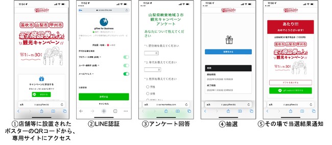 eギフトプラットフォーム事業(※1)を展開する株式会社ギフティ(本社:東京都品川区/代表取締役:太田 睦、鈴木 達哉/以下、ギフティ)は、自治体・地域の課題を解決するデジタルプラットフォーム「e街プラットフォーム(R)」を、山梨県笛吹市、山梨市、甲州市3市内の観光周遊を促進し、観光振興を図ることを目的に、一般社団法人ワインツーリズム等が実施する「山梨峡東3市観光キャンペーン」に、採用いただきました。これに伴い、2022年11月1日(火)から30日(水)の期間中に本キャンペーンに参加し抽選に当選した観光客を対象に、「e街プラットフォーム(R)」の基本ソリューションである「e街ギフト(R)」(※2)を介し発行された電子商品券「山梨峡東3市電子商品券」の付与を開始しておりますので、お知らせいたします。なお、本キャンペーンは峡東地域ワインリゾート推進協議会の事業の1つとして、一般社団法人ワインツーリズム・一般社団法人笛吹市観光物産連盟・山梨市観光協会・甲州市観光協会が協働で実施しており、ギフティは本キャンペーンのシステム提供を行っております。