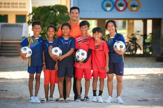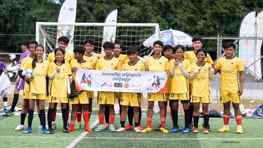 「『キャプテン翼』ボール」を受け取ったカンボジアのチャイルド・スポンサーシップによる支援地域の子どもたちとワールド・ビジョン・スタッフ