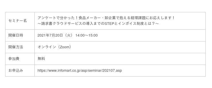 そこで、本調査を踏まえた、経理担当者の課題解決セミナーを7月20日(火)に開催いたします。本セミナーでは、企業の経理担当者がクラウドサービス導入に向けて、どう社内浸透させていけばよいかを他社事例を踏まえて解説いたします。また、ご参加いただいた皆様への特典として、インボイス制度に関する資料をお渡しいたします。