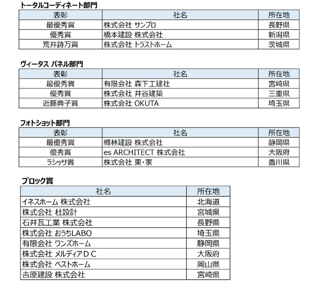 また、ヴィータス パネル部門の最優秀賞には、ウォークインクローゼットに奥行400mmのヴィータスパネルを向かい合わせで使用した“空間活用を考えぬいた大家族の家”を実現した有限会社 森下工建社さま(宮崎県)の作品を選定しました。フォトショット部門の最優秀賞は、グレー色と木目が絶妙にリンクしすべてが調和され考え抜かれた、榑林建設株式会社さま(静岡県)の作品を選定しました。