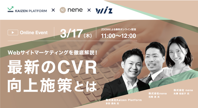 3月17日(木)、Wizは、【株式会社Kaizen Platform UX事業部部長 多田 朋央 氏】、【株式会社nene 取締役 花岡 良 氏】【株式会社nene CCO 矢澤 佑紀子 氏】をお迎えして、 『CVR向上のための「新たな顧客体験手法」とは?Webサイトマーケティングのトレンド徹底解説セミナー』をオンライン開催します。